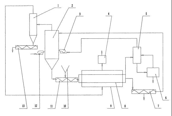 除了采用熱砂直接對污染土壤進行加熱外,還采用砂子在加熱時所產(chǎn)生的熱煙氣間接對砂、土混合物進行加熱,這種直接與間接加熱的雙重方式使得整個熱解吸過程換熱強烈,所以污染物去除率非常高,并且熱源利用率也高,單位體積熱解吸裝置的處理能力非常大。此外,第二燃燒器以從急冷塔出氣口流出的不凝氣體為燃料,從而大大減少了燃燒器輔助燃料的消耗,節(jié)約了成本,非常經(jīng)濟實用。本發(fā)明采用惰性材料-砂子作為熱媒,可用于含油污泥和有機污染土壤熱解吸處置。