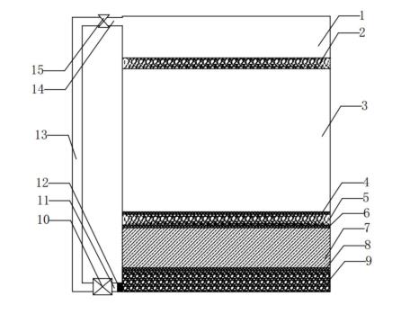 圖中:1、淋洗液儲備室2、第一石英砂層3、砷污染土壤層4、第一尼龍紗布層 ;5、第二石英砂層6、第二尼龍紗布層7、阻隔材料層8、第三尼龍紗布層9、第三石英砂層10、泵11、下端出水口12、微孔濾板13、連接管14、上端進水口15、閥。