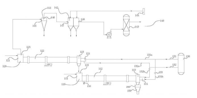 高溫?zé)峤馕G系統(tǒng)包括高溫進(jìn)料斗、高溫?zé)峤馕G、高溫出料斗和高溫燃?xì)膺M(jìn)口,高溫進(jìn)料斗與高溫燃?xì)膺M(jìn)口分別設(shè)置在高溫?zé)峤馕G的兩端,高溫出料斗靠近高溫燃?xì)膺M(jìn)口設(shè)置,高溫燃?xì)膺M(jìn)口與燃?xì)馊紵到y(tǒng)連接。高溫出土料斗與低溫進(jìn)料斗相連。