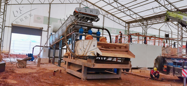 圓筒式擦洗機(jī)由四個拖輪支撐,筒體隨著電機(jī)、減速機(jī)帶動大小齒輪作低速旋轉(zhuǎn)。含有泥團(tuán)和石粉砂石的物料自進(jìn)料口經(jīng)給料裝置 給入,進(jìn)入旋轉(zhuǎn)滾筒內(nèi)的物料被滾筒內(nèi)安裝具有特定角度的攪拌裝置和棒條不斷的帶起、拋起、攪拌,擦洗,自進(jìn)料端到出料端移動 過程中多次循環(huán)過程中被順向或逆向的高壓水柱噴淋不斷洗滌,清洗干凈的物料經(jīng)過卸料端脫水裝置脫水后排出送往成品堆。含有 污泥的污水和細(xì)砂則通過出料端流出,進(jìn)入下一步精細(xì)篩分出細(xì)砂,純泥漿進(jìn)入污水處理工藝。