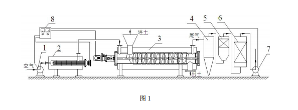 一種強制通風-螺旋攪拌土壤熱解吸修復有機污染土壤的系統(tǒng),包括空氣預熱系統(tǒng)、尾氣 處理系統(tǒng)、控制系統(tǒng),除此更主要的是還包括了有電加熱元件和螺旋攪拌器組成的螺旋攪 拌熱解吸系統(tǒng)。所述螺旋攪拌熱解吸系統(tǒng)位于空氣預熱系統(tǒng)和尾氣處理系統(tǒng)之間。