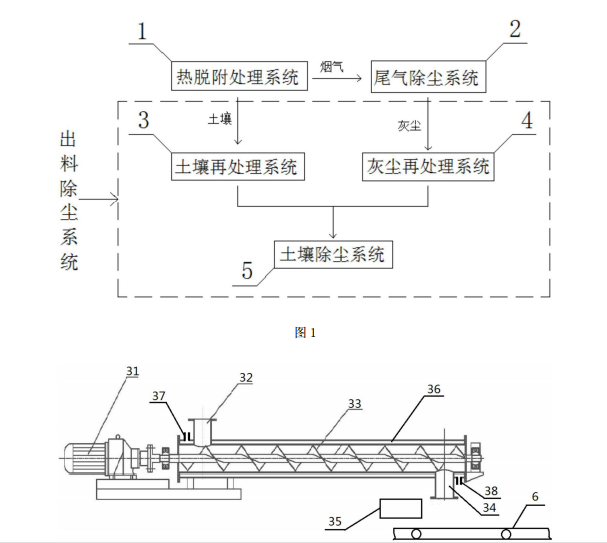 具有出料除塵功能的土壤熱脫附設(shè)備處理系統(tǒng),涉及有機(jī)污染物污染土壤處理除塵技術(shù),包括采用加熱方式處理土壤去除其污染物的土壤熱脫附設(shè)備處理系統(tǒng)和對(duì)熱脫附處理過程中產(chǎn)生的煙塵進(jìn)行處理的尾氣除塵系統(tǒng),其還包括對(duì)熱脫附處理后的土壤進(jìn)行后續(xù)處理的土壤再處理系統(tǒng)和土壤除塵系統(tǒng),所述土壤再處理系統(tǒng)的輸入與所述熱脫附處理系統(tǒng)的輸出相連,所述土壤除塵系統(tǒng)的輸入與所述土壤再處理系統(tǒng)的輸出相連。本發(fā)明通過土壤再處理系統(tǒng)和土壤除塵系統(tǒng)對(duì)出料土壤揚(yáng)塵進(jìn)行有效控制,現(xiàn)場(chǎng)操作時(shí),熱脫附設(shè)備的出料口基本沒有揚(yáng)塵產(chǎn)生,極大地改善了現(xiàn)場(chǎng)的生產(chǎn)環(huán)境,還可以達(dá)到資源的循環(huán)利用。