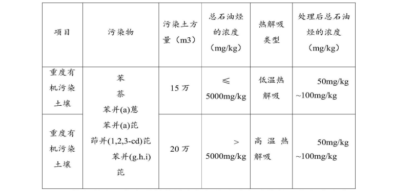 某污染場地為石油化工生產(chǎn)企業(yè),搬遷改造后的遺留場地土壤受到苯、萘和多環(huán)芳烴的污染,污染物濃度、土方量及處理信息,參見下圖所示。在只采用高溫?zé)峤馕募夹g(shù)時,工藝參數(shù) : 高溫?zé)峤馕G的處理量為 20m3/h,高溫?zé)峤馕G的出土溫度為 400℃,窯內(nèi)土壤的停留時間為 15min,每立方污染土的修復(fù)能耗為 60m3天然氣 ;采用本發(fā)明后,工藝參數(shù) :高溫?zé)峤馕G的處理量為 20m3/h,低溫?zé)峤馕鞯奶幚砹繛?14m3/h,高溫?zé)峤馕G的出土溫度為 400℃,低溫?zé)峤馕鞯某鐾翜囟葹?150℃,窯內(nèi)土壤的停留時間均為 15min,立方污染土的修復(fù)能耗為 45m3天然氣,可實現(xiàn)節(jié)能 25%。