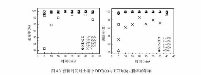 由于DDTs和HCHs各組分的熔點(diǎn)在89-315%范圍之內(nèi),在滾筒溫度升到制定溫度前,它們便熔化出來(lái),這導(dǎo)致當(dāng)停留時(shí)間僅為10min時(shí),土壤中污染物含量很少。DDTs中去除p,p´﹣DDT外,其他組分均能在較短時(shí)間內(nèi)被基本去除,DDTs去除率的變化趨勢(shì)與前文溫度試驗(yàn)中該污染物的去除規(guī)律相同,隨著時(shí)間推移,p,p´﹣DDT在自身分家的同時(shí)形成p,p´﹣DDE,并且由于