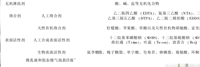 土壤污染源可以是無極污染物或者有機(jī)污染物,土壤淋洗中的淋洗劑可以是清水、化學(xué)溶劑或其他可能污染物從土壤中淋洗出來的流體,具體常見的土壤淋洗劑分類見表:
