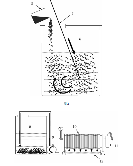 罐中通過加藥器加入藥劑,第二攪拌器攪拌塑料儲罐內(nèi)的溶液 ;沉淀去除所使用的設(shè)備包括塑料儲罐、第三螺桿泵、壓濾機(jī)、第二電動(dòng)機(jī)和蓄水池,第二電動(dòng)機(jī)設(shè)于壓濾機(jī)的一端,蓄水池設(shè)