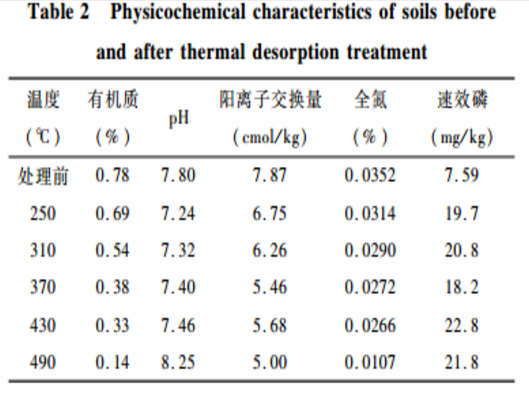 由表格可以看出,熱解吸處理所選擇溫度的不同,污染土壤理化性質(zhì)發(fā)生的改變也不同。當(dāng)然熱解吸溫度由250攝氏度上升到490攝氏度時(shí),pH由7.80先下降到7.24,而后略微增加到8.25攝氏度;有機(jī)質(zhì)與全氮含量整體均呈下降趨勢(shì),分別由0.78%、0.0352%下降趨勢(shì),由7.87cmol/kg降至5.00cmol/kg。與土壤中其他組分變化不同,隨溫度升高,速效磷明顯增加。由7.59mg/kg增至21.8mg/kg。