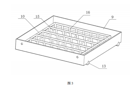 如圖所示,土壤陳列車包括一個上端敞開的箱體,箱體內(nèi)底部兩側(cè)分別設(shè)有可與輸氣主管上的兩個連接頭對接的陳列車內(nèi)輸氣主管,當土壤陳列車在殼體內(nèi)擺放好后,陳列車內(nèi)輸氣主管與殼體內(nèi)的輸氣主管的兩個接頭正好對接,使管道連通。陳列車內(nèi)輸氣主管的中部連接若干平行的陳列車內(nèi)散熱管,土壤陳列車在進入殼體后裝于底部散熱管上方。從進氣管通入熱解析設(shè)備尾氣中的高溫尾氣或直接通入熱空氣,高溫尾氣或熱空氣的溫度和流量能夠根據(jù)土壤污染程度自由控制,通過土壤陳列車內(nèi)部和處理設(shè)備殼體底部分布管道,能夠從各方位排放熱氣來加熱與吹掃土壤。