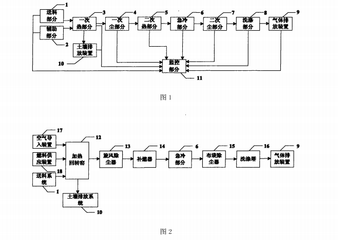在直接熱解吸設(shè)備中,加熱部分包括一次加熱部分與二次加熱部分,送料部分及輔助部分均與一次加熱部分相鏈接,除塵部分包括一次除塵部分與二次除塵部分,排放部分包括氣體排放裝置與土壤排放裝置;一次加熱部分依次與依次除塵部分、二次加熱部分、急冷部分、二次除塵部分,洗滌部分以及氣體排放裝置相連接,一次加熱部分還與土壤排放裝置相連接,組件還分貝與監(jiān)控部分相連接,另外,洗滌部分為洗滌塔,其末端與氣體排放裝置連接。直接熱解吸設(shè)備內(nèi)部結(jié)構(gòu)合理,其整套系統(tǒng)結(jié)構(gòu)完善,半智能進(jìn)料系統(tǒng)可在線監(jiān)控,回轉(zhuǎn)窯及其加熱系統(tǒng)的高效處理能力,過(guò)程氣體的二次除塵,燃燒破壞、冷卻、洗滌、保證整體系統(tǒng)運(yùn)轉(zhuǎn)的效率。直接熱解吸設(shè)備有處理量大、能耗低、處理費(fèi)用低和保持土壤理化性質(zhì)等優(yōu)點(diǎn),能有效的將有機(jī)物從污染土壤中分離出來(lái)并進(jìn)行處理;有效解決了現(xiàn)有有機(jī)物污染土壤場(chǎng)地修復(fù)處理技術(shù)的能耗高,會(huì)破壞土壤理化性質(zhì)等缺點(diǎn)。