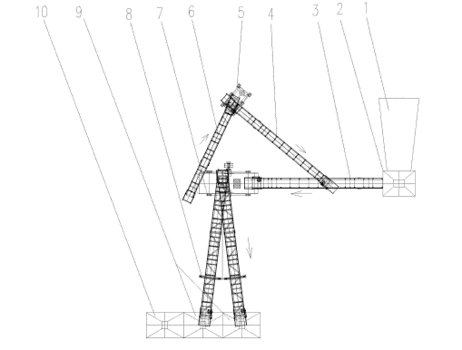 用于土壤和廢渣修復(fù)的篩分破碎集成設(shè)備,其特征在于,包括原料倉、振動給料 機(jī)、喂料皮帶機(jī)、返回皮帶機(jī)、破碎機(jī)、中間皮帶機(jī)、振動篩、出料皮帶機(jī)和土壤倉,所述振動給料機(jī)吊裝固定在原料倉的出料口的下方,所述振動給料機(jī)的出料口連接喂 料皮帶機(jī)的進(jìn)料端,所述喂料皮帶機(jī)的出料口連接振動篩的進(jìn)料口,所述振動篩的篩下物 與出料皮帶機(jī)的進(jìn)料端連接,所述出料皮帶機(jī)的出料端位于土壤倉的上方,所述振動篩的 篩上物與中間皮帶機(jī)的進(jìn)料端連接,所述中間皮帶機(jī)的出料端與破碎機(jī)的進(jìn)料口連接,所 述破碎機(jī)的出料口與返回皮帶機(jī)的進(jìn)料端連接,所述返回皮帶機(jī)的出料端位于喂料皮帶機(jī) 的中部上方。