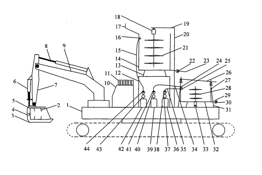污染土原位固化/穩(wěn)定化處理設(shè)備,屬于污染場地修復(fù)工程技術(shù)領(lǐng)域。設(shè)備由履帶式挖掘機、篩分破碎系統(tǒng)、攪拌系統(tǒng)、土壤處理系統(tǒng)、藥劑供給系統(tǒng)、操作控制系統(tǒng)和管線組成。篩分破碎系統(tǒng)能 破碎污染土中的硬土塊,篩分出污染土中的石塊、塑料等雜質(zhì),使設(shè)備能適應(yīng)復(fù)雜工況的施工,同時,保證了攪拌系統(tǒng)的連續(xù)運行。土壤處理系統(tǒng)可進(jìn)一步去除污染土中的大顆粒狀物質(zhì),降低了污 染土處理量,節(jié)約了處理成本。所有藥劑倉和設(shè)備集成于履帶式挖掘機上,運輸施工方便。本發(fā)明的污染土原位固化/穩(wěn)定化處理設(shè)備集土方開挖、土壤篩分、藥劑添加、均勻攪拌、場地平整和自 動化控制于一體,結(jié)構(gòu)緊湊、操作方便、適應(yīng)性強、效率高。