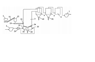 為了說明本發(fā)明所述的技術(shù)方案,下面通過具體實施例來進行說明。 本發(fā)明提供的一種染土壤熱解析異位解吸脫附修復(fù)系統(tǒng)包括土壤破碎機 1、送風(fēng)機 2、流 化床 3 和旋風(fēng)分離器 4。 土壤破碎機 1 對污染土壤進行破碎處理后生成污染土壤顆粒,輸入流化床 3。 送風(fēng)機 2 的出風(fēng)口與加熱器 21 的進風(fēng)口相連,加熱器 21 的出風(fēng)口通過管道與流 化床 3 的進風(fēng)口 33 連接,根據(jù)污染土壤的污染物的性質(zhì),通過加熱器 21 對流化空氣的溫度 進行調(diào)節(jié),加熱后的流化空氣進入流化床 3 開始流化污染土壤顆粒,促進揮發(fā)性及半揮發(fā) 性污染物的揮發(fā)。 流化床 3 上端還連接旋風(fēng)分離器 4,土壤顆粒在流化的同時不斷被流化空氣帶出 至旋風(fēng)分離器 4,干凈土壤經(jīng)旋風(fēng)分離器 4 分離后從旋風(fēng)分離器 4 下端的凈土出料口 41 排 出。
